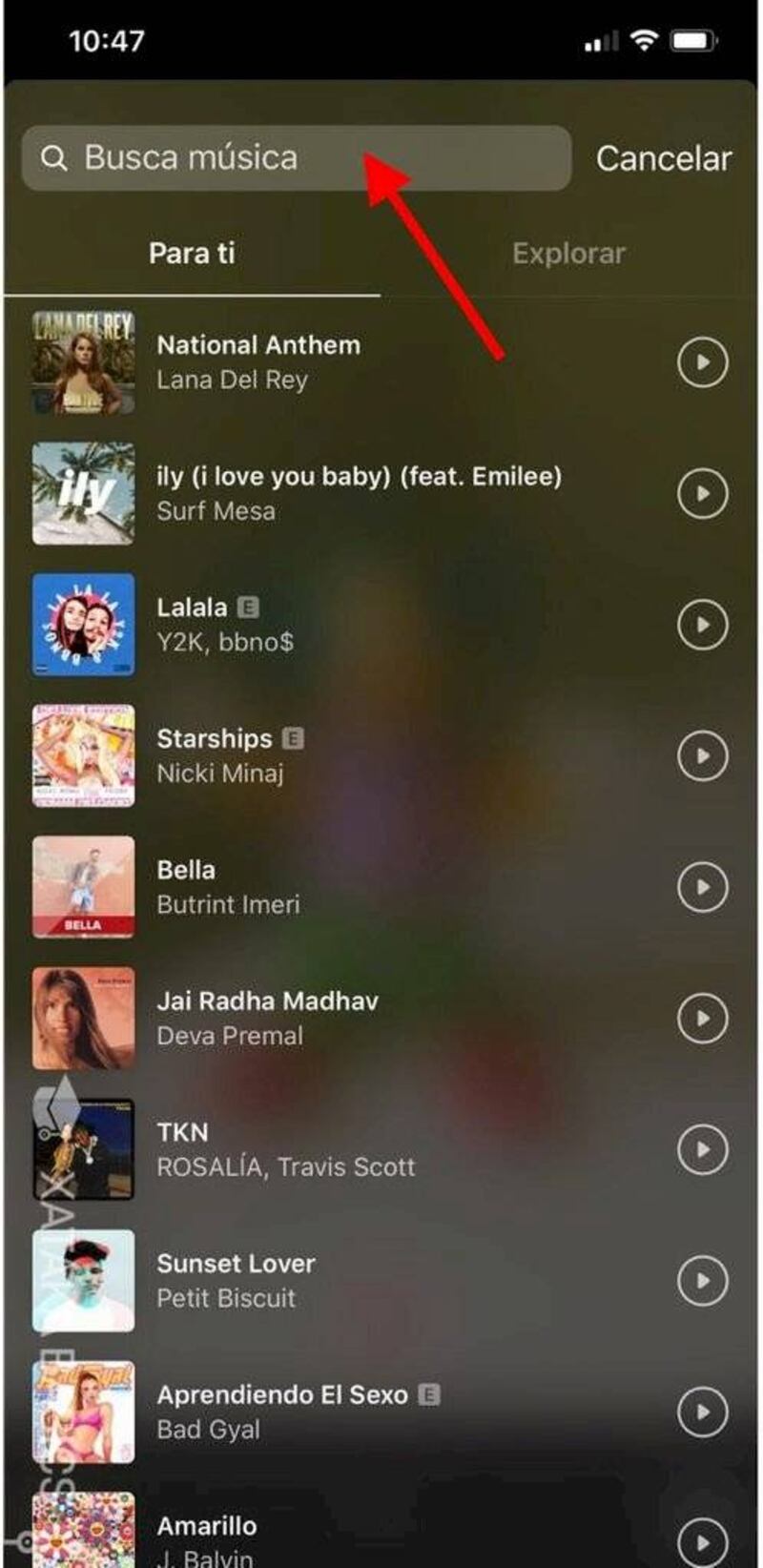 Para añadir una canción a tu video, puedes usar las sugerencias que se muestran o buscar una canción concreta usando el buscador. Antes de elegir una canción puedes escuchar una previsualización pulsando el botón de reproducción.