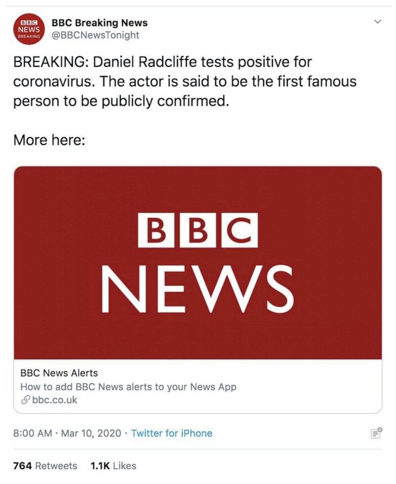 Los usuarios de Twitter se vieron sorprendidos ante una imagen que se volvió viral en la red social. En ella, la cuenta oficial de la BBC News confirmaba que Daniel Radcliffe, el famoso actor que interpretó a Harry Potter, había sido diagnosticado con coronavirus. En el comunicado se establecía al actor como la primera persona famosa oficialmente contagiada. Puedes ver la captura de pantalla a continuación.