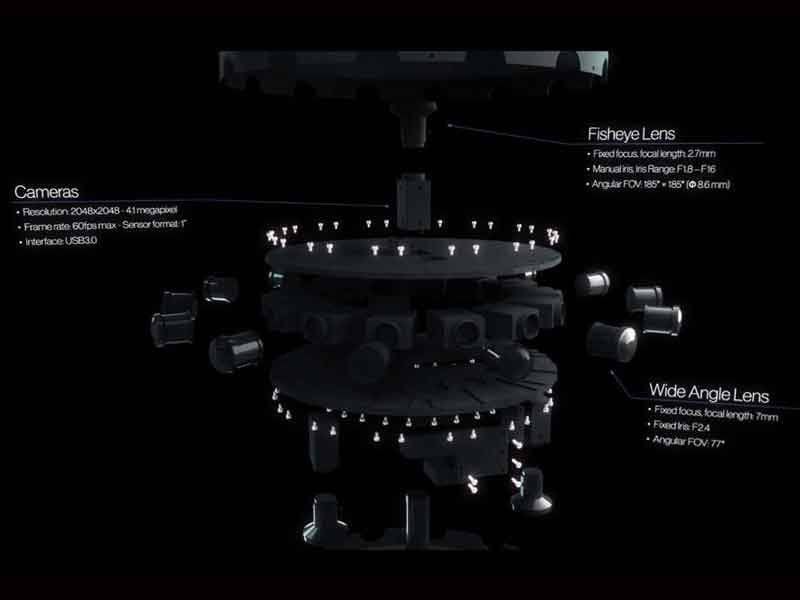 Entrando ya en las especificaciones, la Facebook Surround 360 será capaz de capturar video en 4K, 6K y hasta 8K, esto gracias a que sus 17 cámaras capturan imágenes de 4 megapixeles, cada uno colocado alrededor del plato, pero también uno 'fish eye' de la parte superior y dos en la parte inferior, por lo que no habrá espacio que se le escape a esta cámara. El resultado son archivos de 30 Gbps que son transferidos de forma directa a una unidad SSD por medio de USB 3.0.