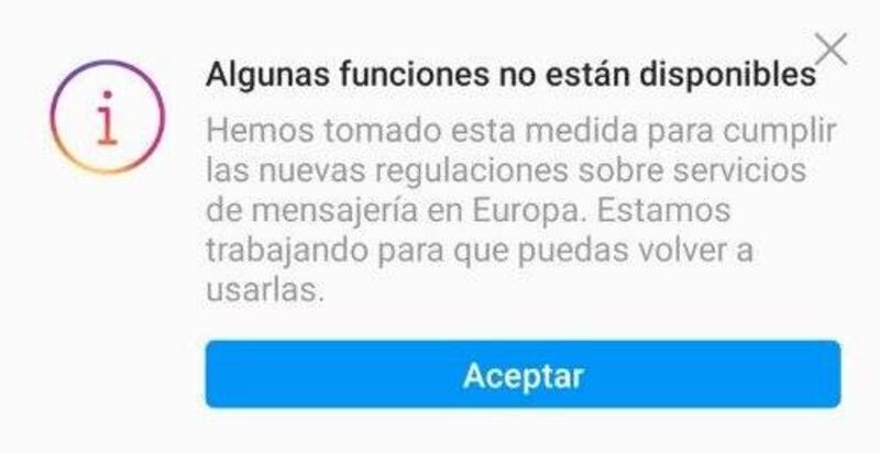“Algunas funciones no están disponibles. Hemos tomado esta medida para cumplir las nuevas regulaciones sobre servicios de mensajería en Europa. Estamos trabajando para que puedas volver a usarlas”, es lo que dice el mensaje completo que aparece en la parte superior de la aplicación.