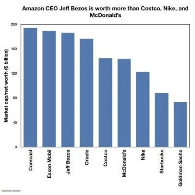 En total, el dueño de Amazon cuenta con más dinero que 30 compañías del Dow Jones. Entre ellas están Oracle (176 billones), IBM (112 billones) y Starbucks (88 billones).