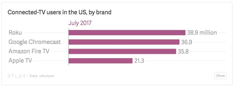 Roku pasó de 33 millones el año pasado a casi 39 millones. De todos los dispositivos fue el más que creció. Chromecast le sigue con 2 millones y el Fire TV 3 millones más abajo. Por su parte, el Apple TV parece no terminar de convencer a los usuarios, o al menos como para justificar su elevado precio.