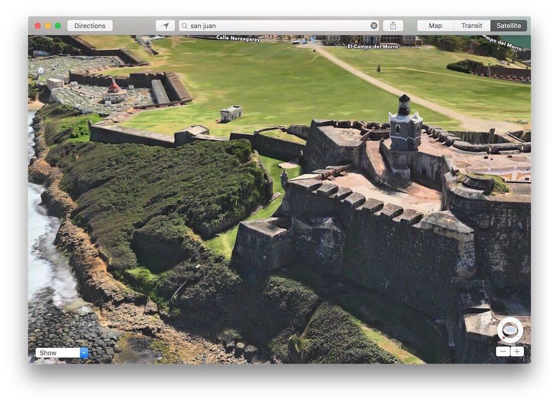 Los mapas 3D son un complemento de gran ayuda cuando estamos en ciudades que no conocemos ya que nos presentan de una forma más real y en una perspectiva diferente el lugar donde estamos o que vamos a visitar. Por ejemplo, si algún turista nunca ha ido a El Morro, con tan solo dar un recorrido en Apple Maps con la opción de mapas satelitales en 3D podrá tener una visión más clara de cómo luce y los lugares que están a su alrededor.