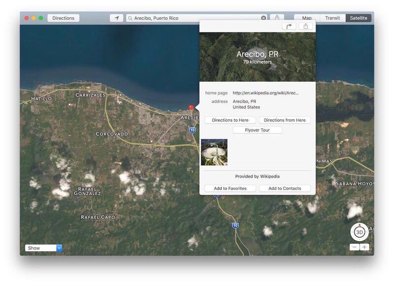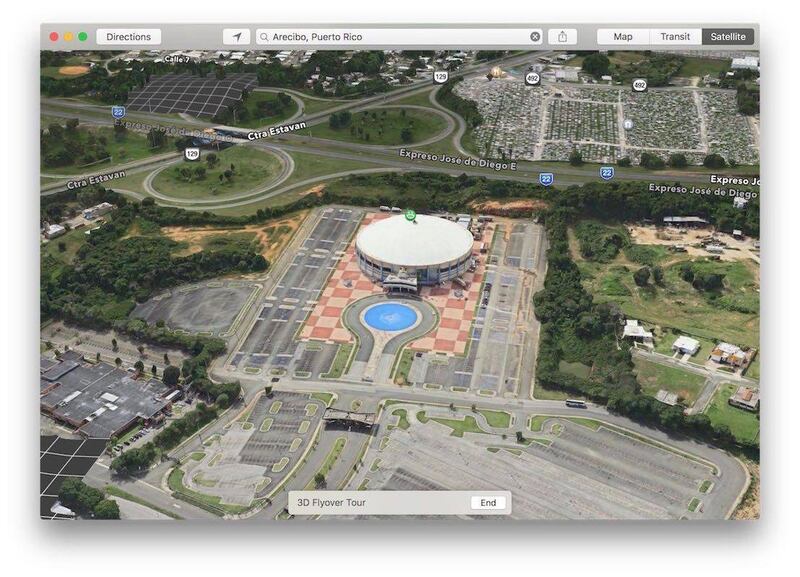 El tour virtual de Flyover aparece al buscar por algún pueblo o lugar importante. En el caso de Puerto Rico, con tan solo escribir, por ejemplo, “Arecibo, Puerto Rico” aparecerá en pantalla una opción para el tour de Flyover. Impresionante por demás ver los recorridos que hace en 3D.