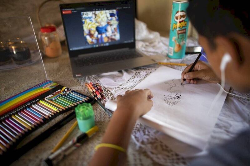 Samuel Andrés Medina elige cuidadosamente los colores de decenas de lápices esparcidos sobre la atestada mesa de la cocina de su humilde hogar en Venezuela mientras se sienta a dibujar. El adolescente realiza trazos largos y cortos para lograr diferentes efectos en su dibujo. Tararea reguetón mientras sostiene lápices de colores de diferentes longitudes y cambia la presión para agregar contrastes al personaje de anime que toma forma en su bloc de dibujo.