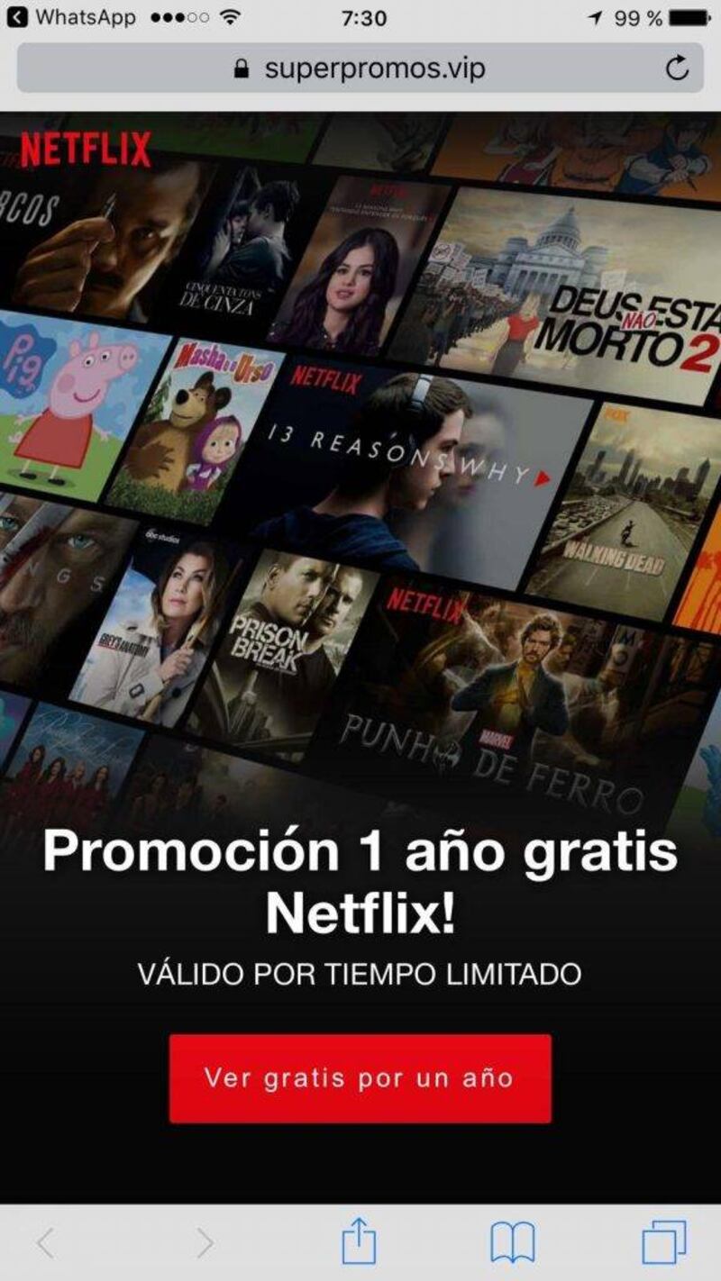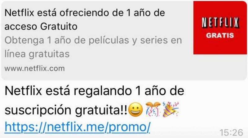 Varios medios especializados advirtieron de una nueva estafa que está afectando a los usuarios de Whatsapp. Al parecer, se trata de un link que ofrece un año gratis de suscripción a la versión 'premium’ de Netflix. Y, como era de esperar, la oferta está causando estragos en más de un smartphone. Pero que no te engañen, porque detrás no hay Netflix ni nada de nada, solo un virus.