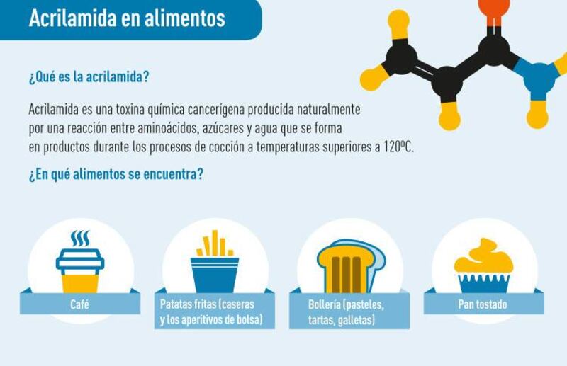 La acrilamida es una sustancia química que se encuentra en dichos alimentos cuando éstos están muy quemados o fritos. Esta polémica sustancia no se halla en los alimentos crudos, ya que se forman durante los procesos de cocción extensos y a altas temperaturas (sobre los 120°).