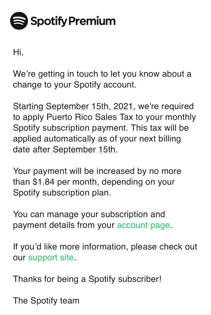 “Comenzando el 15 de septiembre del 2021, nos será requerido aplicar el Impuesto de Ventas de Puerto Rico a tu subscripción mensual de Spotify. Este impuesto será aplicado automáticamente a tu fecha de pago posterior al 15 de septiembre”, lee la comunicación a los clientes.