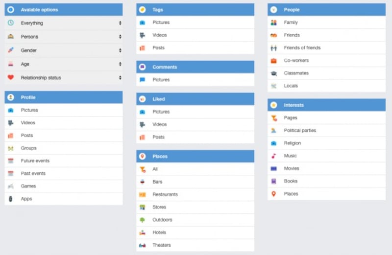 Debajo aparecerán las categorías entre las que puedes navegar, incluyendo imágenes, comentarios, videos, grupos, páginas, eventos y lugares a los que asiste, etc., también permite ver su lista de familiares, amigos e incluso amigos de amigos, eso sí también tiene esta información disponible como pública.