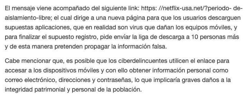 “La Secretaría de Seguridad Ciudadana a través de la Policía Cibernética detectó el envío de mensajes falsos por delincuentes que afirman que la empresa de entretenimiento digital Netflix regala membresías para su plataforma durante este periodo de aislamiento.”
