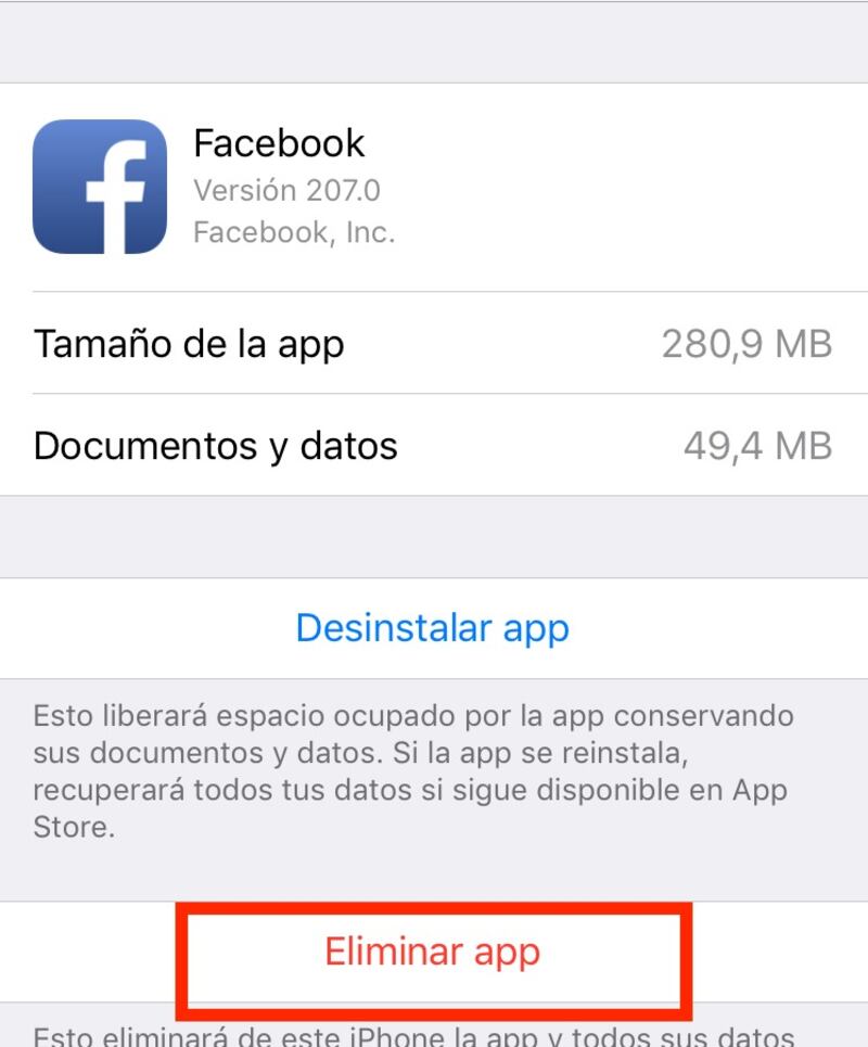 Si todavía ves que el problema persiste y que ciertas aplicaciones ocupan más espacio de lo normal, aún puedes hacer algo. Simplemente accedes al mismo menú de la opción anterior y a las opciones de cada aplicación por específico. Una vez hecho, deberás tocar “Eliminar app”. Solamente deja que el sistema haga su trabajo y después de ello vuelve a instalar la aplicación.