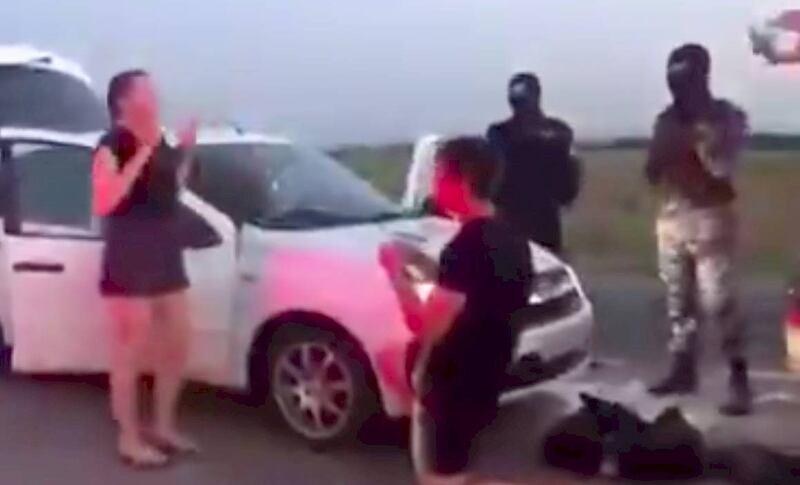 Todo esto sucede ante el ojo atónito de los transeúntes. De inmediato, y en un momento, el conductor del auto se libera de los militares, se arrodilla, saca un anillo y le propone matrimonio a su novia. La joven grita emocionada, olvidando por completo el susto cabr*n que el hijuelagran de su novio le ha hecho pasar.