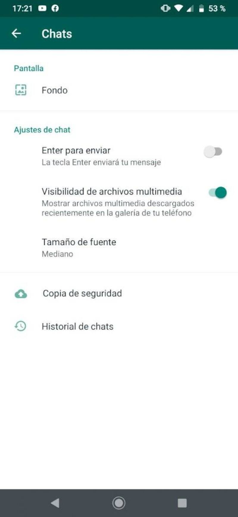 Deberás entonces entrar a “Ajustes” y después entrar a “Chats” con lo que entrarás a un menú más amplio, donde se te dará la posibilidad de desactivar el guardado automático de imágenes.