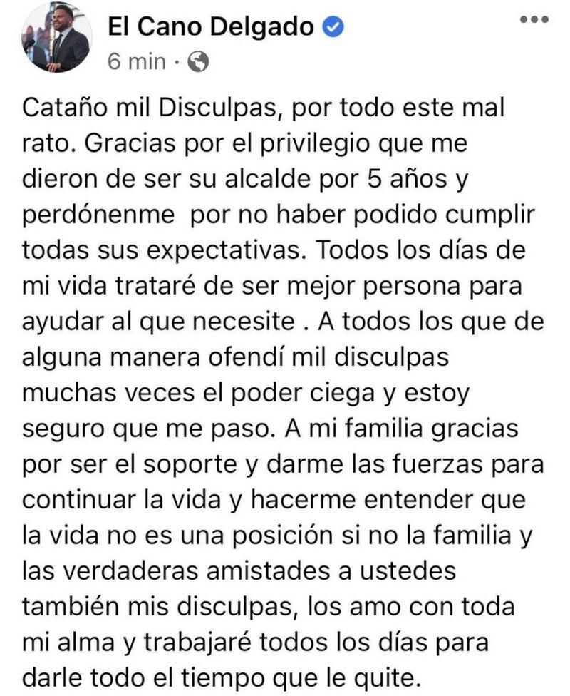 “Cataño mil disculpas por todo este mal rato. Gracias por el privilegio que me dieron de ser su alcalde por cinco años y perdónenme por no haber podido cumplir todas sus expectativas. Todos los días de mi vida trataré de ser mejor persona para ayudar al que necesite. A todos los que de alguna manera ofendí mil disculpas muchas veces el poder ciega y estoy seguro que me pasó. A mi familia, gracias por ser el soporte y darme las fuerzas para continuar y hacerme entender que la vida no es una posición si no la familia y las verdaderas amistades a ustedes también mis disculpas, los amo con toda mi alma y trabajaré todos los días para darle todo el tiempo que le quite (sic.)”, escribió ’El Cano’ sin comas, acentos y par de errores ortográficos.