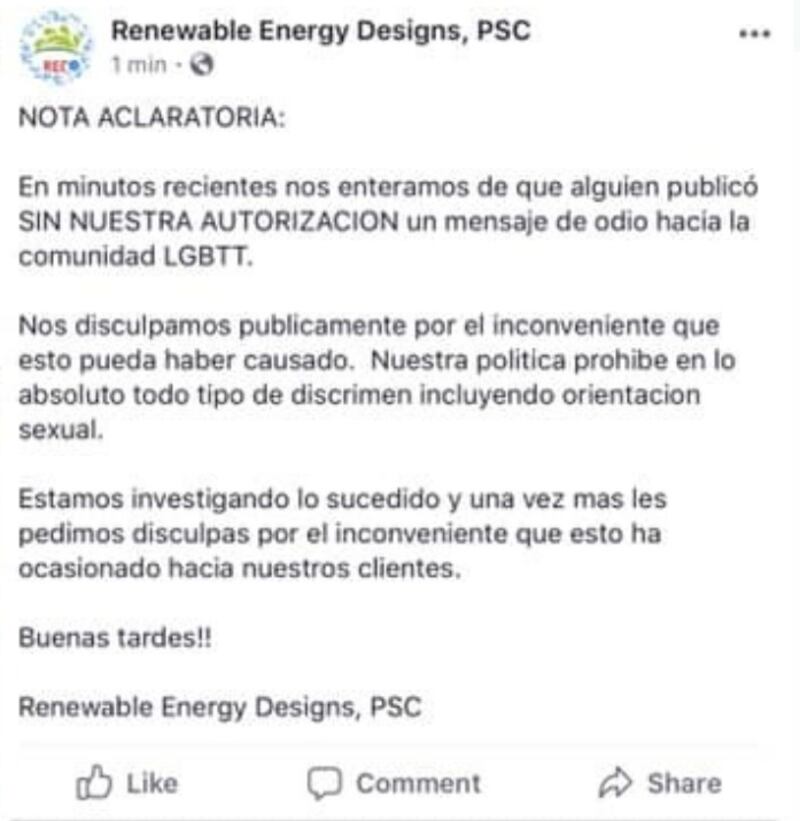 Renewable Energy Design PSC publicó las expresiones en su perfil en Facebook. Tras las denuncias, la compañía aparentemente bloqueó temporeramente o borró la página. Antes de esa acción, compartió declaraciones en las que pedía disculpas y aseguraba que la primera publicación había sido realizada sin autorización.