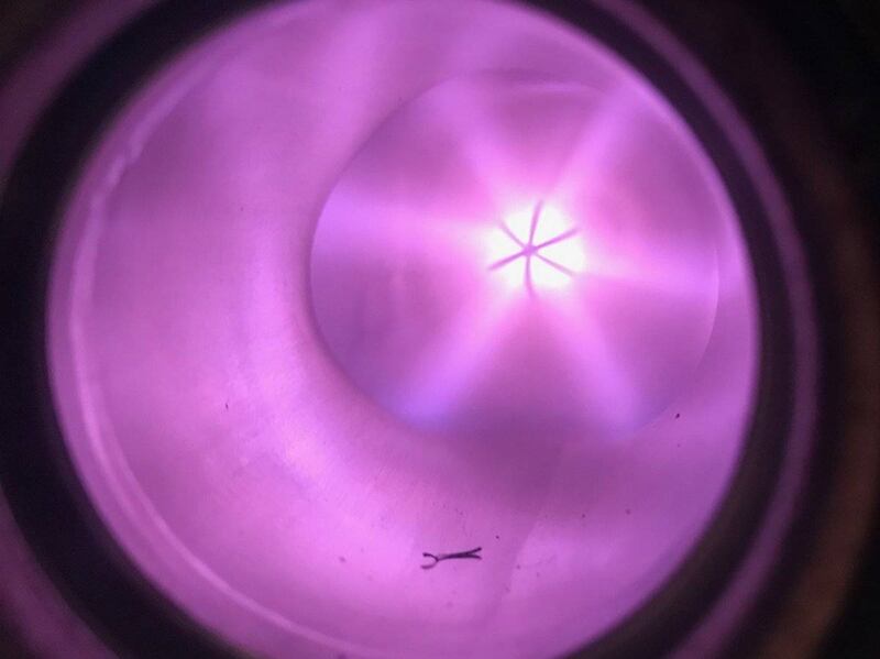 Este es otro pequeño fusor que funciona bien y muestra que lo está haciendo con una instrumentación adecuada. Una vez más, la eliminación del tubo detector del moderador redujo el conteo a cero y la reinserción reanudó el conteo. Esto, junto a la imagen de la descarga rosa y los rayos en estrella, representan una verdadera muestra de fusión, independientemente del conteo final, los errores en el conteo, etc”.